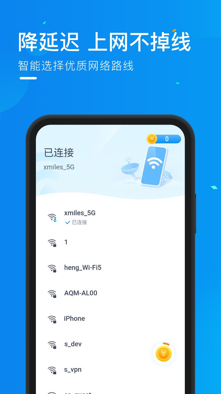 一款功能齐全的WiFi连接软件,安装到手机上之后能够为用户免费提供强大的WiFi破解功能,无论多复杂的WiFi密码都能在线破解,实时连接,让你走到哪里都有WiFi可连!此外,用户将个人WiFi账号添加到软件上之后还可以使用手机进行管理,轻松解决他人蹭网问题,保障流畅网速!每天登陆还可以领取积分兑换奖品哦!