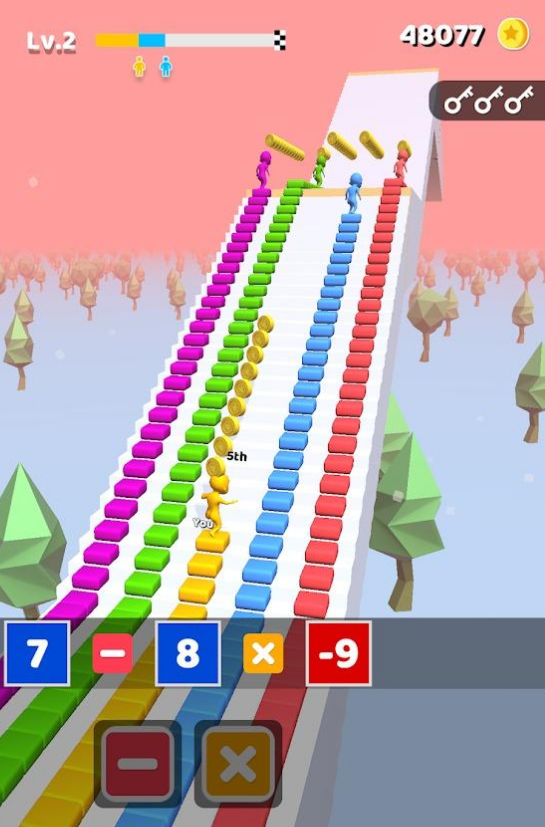 最大值计算竞赛是一款以数学计算为核心的跑酷游戏,玩家可以解锁多种闯关模式,感受多人同台竞速的玩法魅力,收集更多的道具,在最后和其他玩家进行对比,看谁的收集值最大,可以给玩家带来全新的酷跑体验,难度逐渐上升,特别考验玩家的反应能力和手速。你要合理的验算出已知的数字和运算法则,获得计算结果的最大值,才有机会在竞赛中取胜。尽量争取获得金钥匙,解锁跟多皮肤,快来下载体验吧。