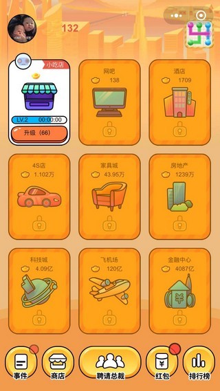 1、从零开始开商店,商店会自动产生收益并且打到账户余额上就这样成就了富豪;