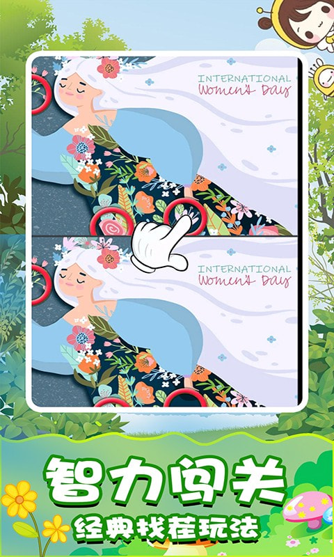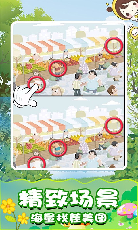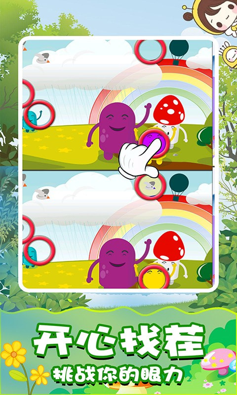 开心找茬找不同是一款儿童喜爱玩的益智游戏,目标是寻找图片之间的不同点,哪里不同点哪里。两张看起来一样的照片,有一些细微的不同,运用你聪明的大脑发现它们,特别为儿童宝宝设计了卡通可爱的图片,过关还能获得一个超可爱卡通装扮,在装扮里面我们可以将宝宝打扮的漂亮又可爱哟!如果太难了找不到不同的地方怎么办?每个关卡有免费提示的道具可以使用哦,帮助你成为开心找茬找不同的高手。