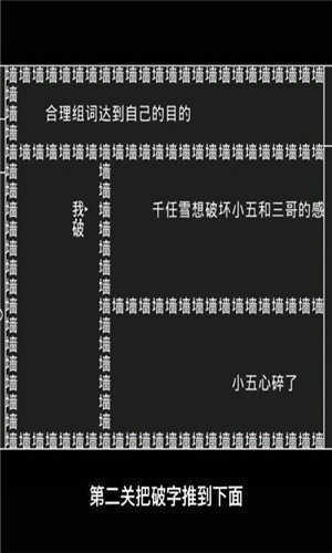 第二关,把破字推到下面,利用破子把墙推开,然后再把碎字推出去,利用碎字把冰字推开。