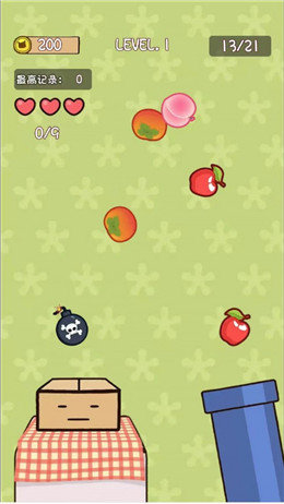 游戏中里面会有随机飘散的水果,你必须找准时机用箱子接住它们。