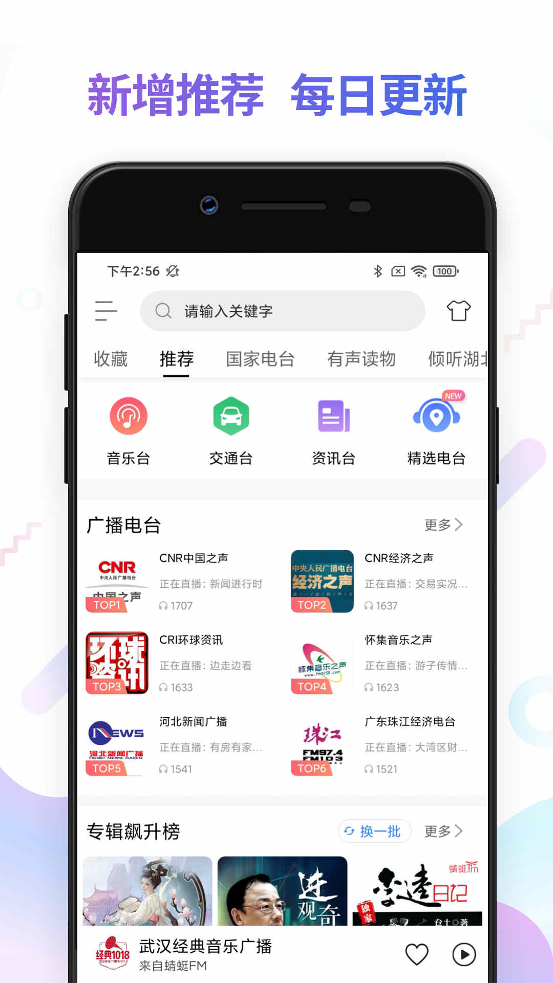 fm电台收音机APP是一款非常不错的手机广播软件并且音质清晰,有详细的热门电台榜单,音乐、相声、评书等一应俱全,可以满足大多数喜欢听电台的朋友们。精准搜索:输入关键词即可搜索您喜爱的电台;便捷操作:简洁的播放模式方便快捷,随点随用;收藏电台:收藏您喜爱的电台,可以快速进入,好电台不用找。最新内容即时听,每天汇集千万条优质信息。让您随时随地,想听就听。