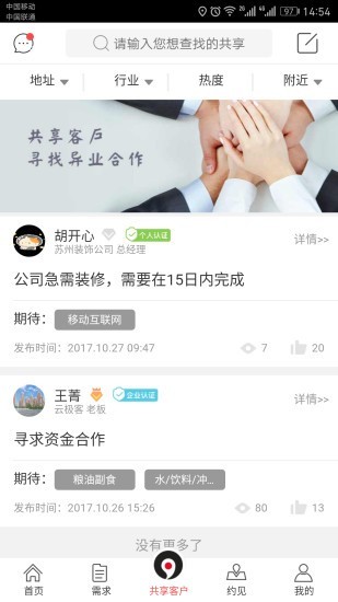 3万+家中小企业客户资源,每月2场项目对接会,100人的商务团队1对1生意对接,在这里企业之间资源共享信息互通,相互依存、互利共惠,凝聚、整合大量的企业资源和经济资源,为更多的企业财富提供有力的保障,机会,只垂青最先行动的人,下载生意圈app,找商机,找人脉,投项目,寻资源。