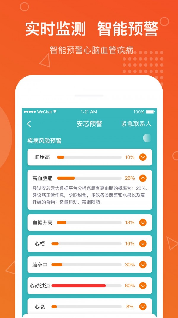 【健康预警】通过对实时健康数据的监测与分析,对24种疾病进行实时监测,并对18种远期心脑风险进行提前预警,让您的疾病早发现早治疗