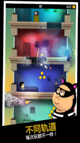 ▲游戏的画面非常简单而且可爱。注意到冰箱,冰箱可以让你拥有短时间内无敌的效果!如果准备好要往下跳了,就在画面上往下拨动。可千万不要忘记拿走所有金币了!另外你可以踩坏(破坏)家具等等物件来获得金币!