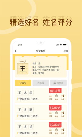 2.根据宝宝的生辰日历辅以三才五格、生肖星座搭配,兼顾音、形、意起名打分,为您推荐高分吉名,更有海量美名,任您免费挑选