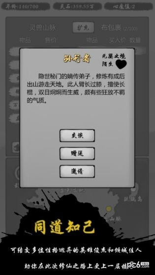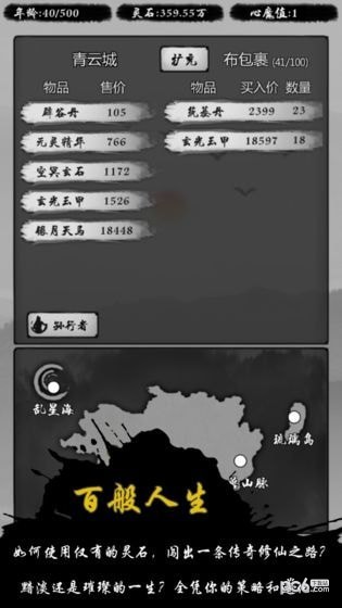 修仙商人是一款文字修仙游戏!玩法简单有趣,你将使用仅有的灵石,依靠策略买卖物品,辟谷丹?筑基丹?玄光玉甲?各式各样的修仙商品,让你在感受赚取灵石乐趣的同时,不断突破自己的境界,成为一名强大的修士,最终能否在大限到来前登仙成为修真界的传奇!修仙商人游戏是一款东方玄幻类的文字游戏,黑白风格的游戏画面,你将扮演一名修仙者,前往各个地图中冒险,你需要收集更多的材料,完成各种各样的任务可以获得丰厚的奖励,还能提升你的战力,更多随机的事件发生,你需要做出正确的选择,超多修仙商品等你来买卖,采取适合的策略来打造不一样的仙侠人生。