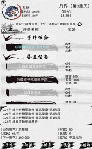 2、修仙模拟器我定成仙游戏画风非常的简洁精美,分类也分的十分的具体详细,所有的功能板块一目了然。