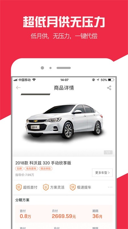 购车首次付款只需10%-20%,含购置税,送1年保险。选择空间更大,资金占用更少。