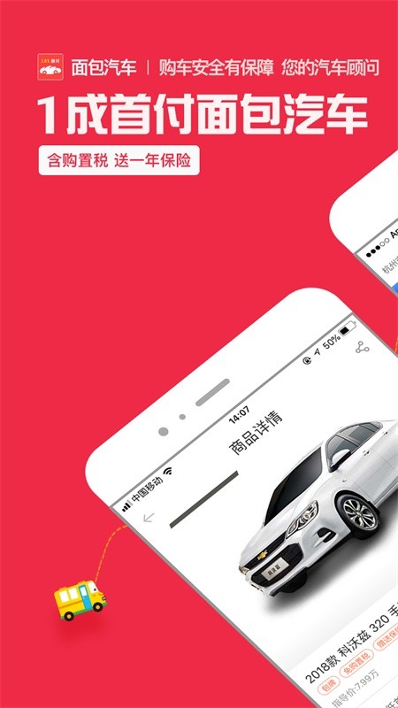 1、面包汽车app,1成首付,含购置税,送一年保险;