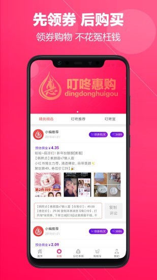 叮咚惠购app是一款优惠商品购物平台,在上面有着各种优惠商品,每一个商品都是有着优惠卷的,可以非常便捷的进行购物,自由选择购物的商品!叮咚惠购基于淘宝天猫超新星全员导购计划,为推手,导购,宝妈,物流人员等群体提供社群型社交电商服务。用户通过京友惠app,就有机会获得京东99%的商品优惠或者超值返利,用户既可以自己购买到优惠好货,还可以分享商品给好友赚取丰厚佣金,让购物变得简单快乐。