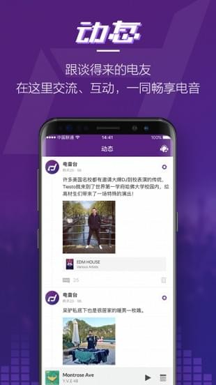 电音台app是一款影音播放应用,是专为音乐爱好者提供的电子音乐生活服务平台。在电音台app中你可及时获取最新发行的电音单曲,在线聆听音乐,以及结交电友等。