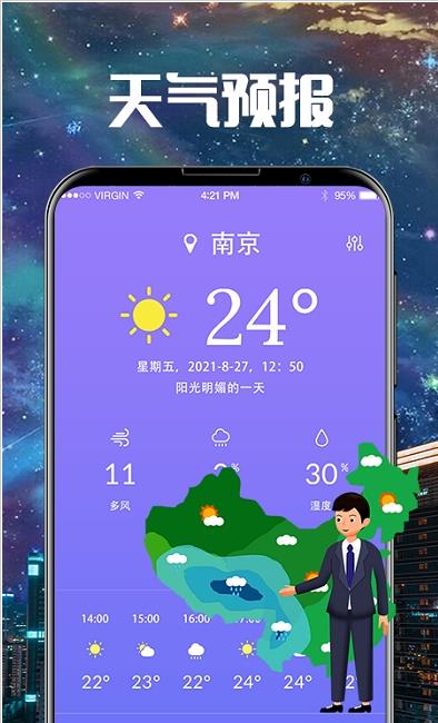 3、预报信息,24小时天气及温度预报;未来天气信息及趋势对比;支持2486个国内城市区县和676个国际城市。