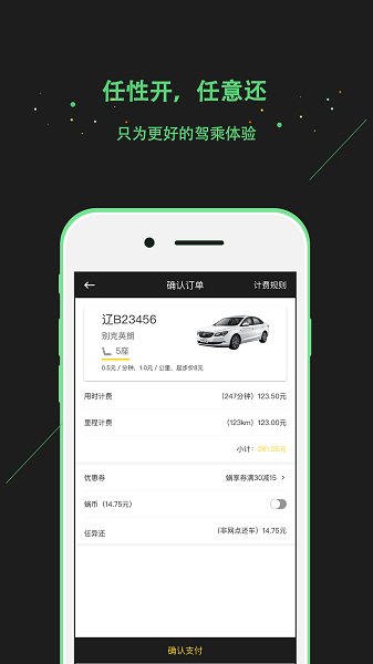 在线支付功能,APP支持用户在还车的时候就快速支付租车费用;