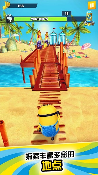 在根据《神偷奶爸》电影打造的地点奔跑,体验令人震撼的3d游戏环境。当小黄人在布拉特的老巢、反恶棍联盟、埃及金字塔狂奔时,您可以感受到速度带来的刺激。