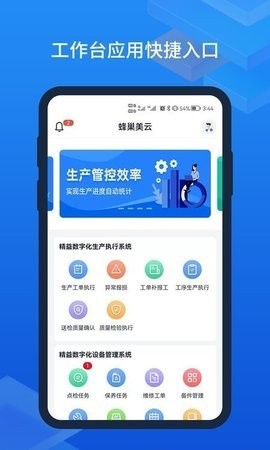 蜂巢美云app这里可以为用户提供生产任务在线执行的功能,还有不同的设备点检,工作台应用的快捷入口,生产作业过程的全面管理,你需要的这里基本上全部都有,可以为许多用户带来和提供更专业与更赞的线上云办公好体验和好服务,目前所有最新的状况和情况,这里都可以提供更加正确的管理决策,运营效率这里一键完成哦。
