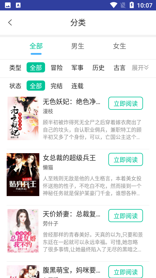 分类超级多样,可根据喜好选择男频或者女频,也可以根据小说推荐来阅读!每个频道下面,都包含各种分类,让你一饱眼福,爱不释手!