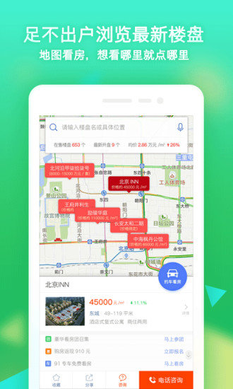 简约强劲的地图查询,兼容新楼盘图,楼价图和最火地域几种展现。加入乐居已有特惠及在网上特惠、兼容快车看楼,并配搭看房团及活动推广,让您购房放心又省时。服务平台出示高清航拍、短视频、照片等几种媒体工具,多方位展现房源信息。