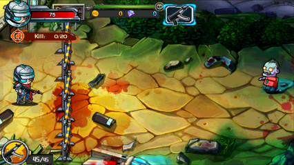 游戏以横版2.5D形式展开,画面上采用抽象卡通的风格呈现,整体风格偏向阴暗,重色调的色彩侵染让整个环境都变得更沉闷。游戏中的人物和僵尸并没有一丝真实的感觉,虽然已经尽力把僵尸画得很恐怖了,但卡通还是卡通,看起来甚至有些搞笑的趣味,而不时喷溅到屏幕上的血液似乎又说明着战争的严肃与残酷。