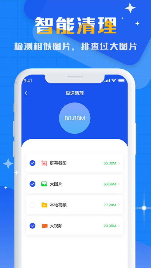 1、帮助用户管理手机里的文件,可以智能进行识别无用的文件,然后进行快速的清除;