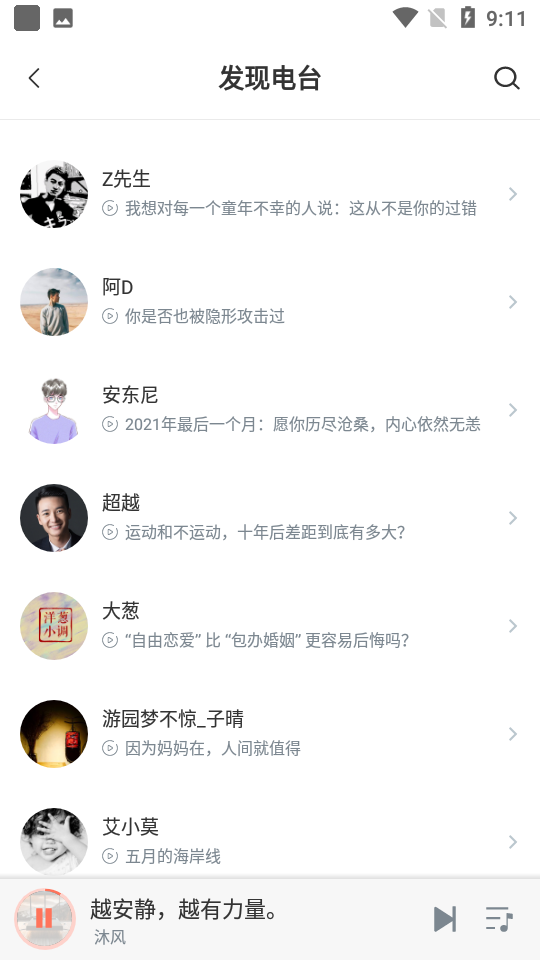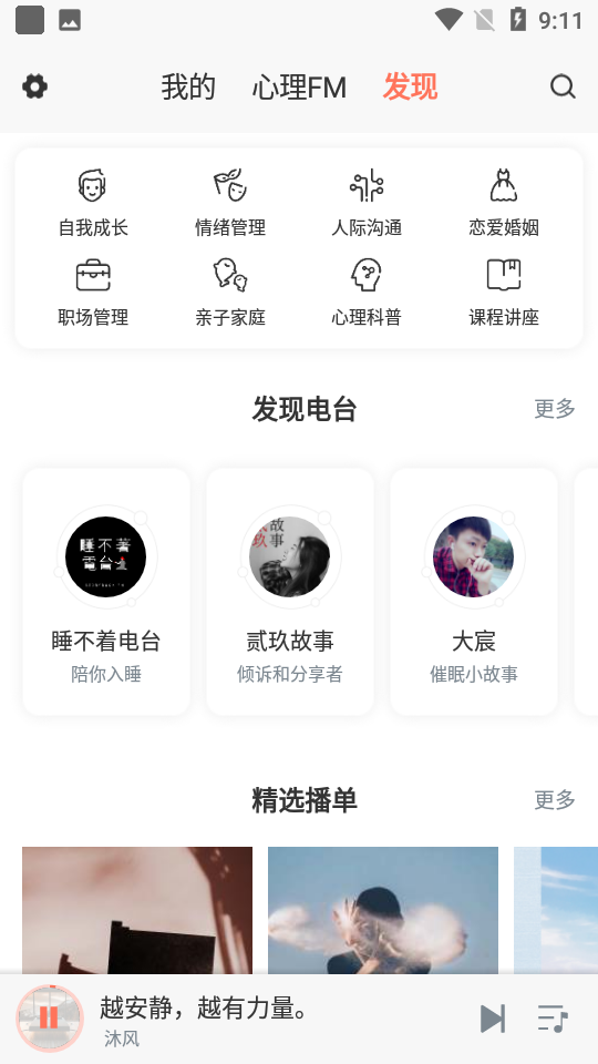 每个人在每天都会遇到很多的不怎么开心的事情,但是这些事情又是我们无法解决的事情,这时我们就需要有一款不错的心理软件来帮助我们解决这些问题了!抚慰心灵受伤的人们。心理FM由壹心理官方出品,是一个专注心理成长、心情故事、情感陪伴音频节目的治愈系心理电台,曾被南方都市报、36氪等多家媒体报道,获2012年公益奖、第 一届小米金米奖。