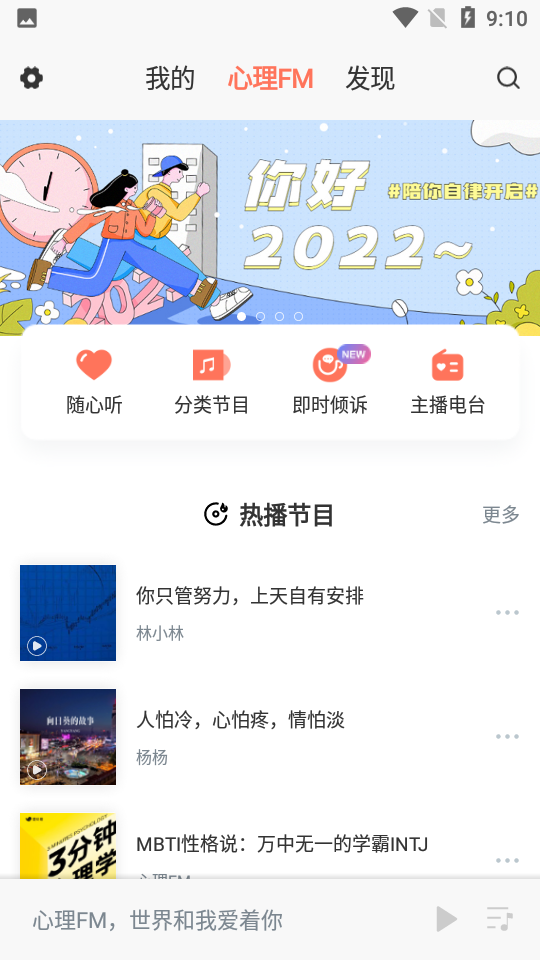 -我是位刚结婚生子的女子,每天上班很累,生活充满重复和枯燥,每晚睡觉前都是心理FM给予我无限的力量和温暖。--泥黄金
