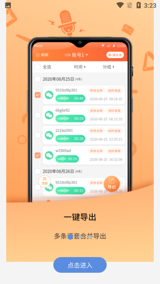 语音导出精灵app是款非常好用的手机在线进行语音导出的工具,能够完好快速的机型语音信息,还可以随心的切换账号,操作过程也没有很复杂能够很快速的上手,还能轻松的制作出你想要的个性化的语音文件。语音导出精灵软件帮助用户导出社交软件的语音消息。支持一键合并多条语音文件,合并后的语音文件支持转发到微信群或微信好友。