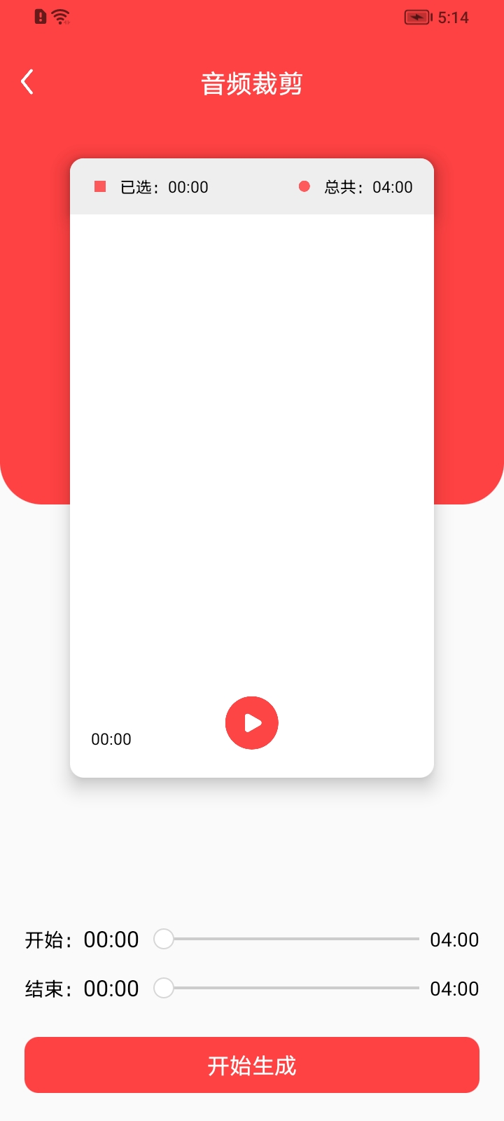 页面左上方显示已选时长,右上方显示音频总时长,点击中间播放按钮可以试听音频。在页面下方调节需要裁剪的音频开始时间和结束时间,选择完成后点击“开始生成”按钮准备生成。