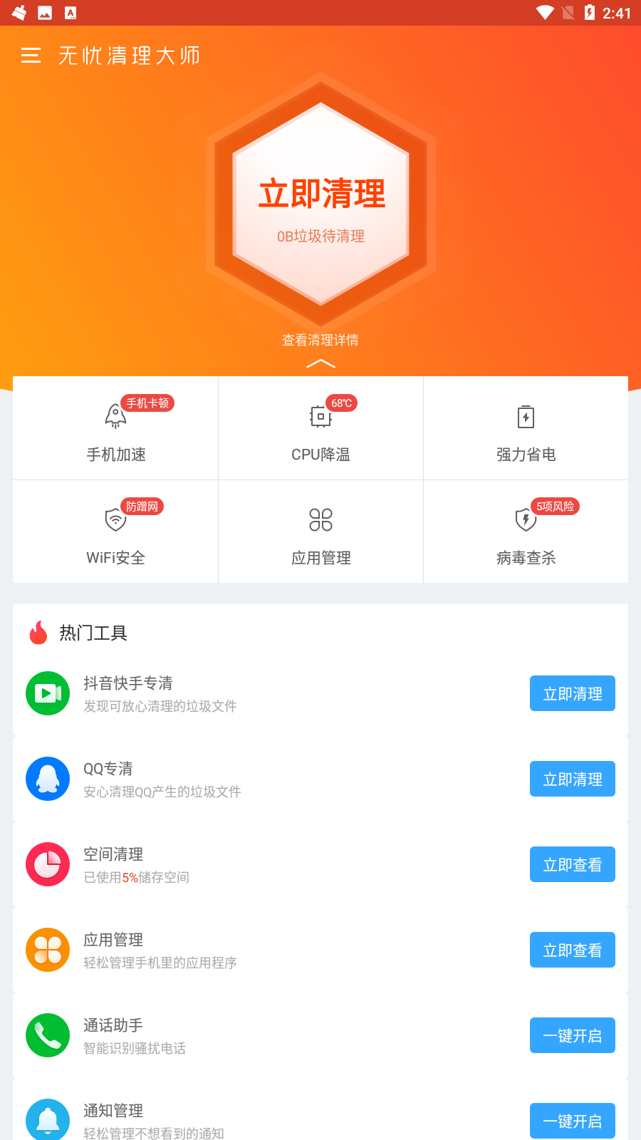 无忧清理大师是一款非常实用的手机垃圾清理服务软件,软件功能非常强大,这里提供垃圾清理、手机加速、CPU降温、电池优化等多种功能,能够轻松帮助你轻松手机垃圾,让手机运行更顺畅!有需要的朋友别等了,软件里面的各种清理功能都是免费的,还可以根据用户们的需求来检测病毒等,快速清除,整理出更多的空间。快来下载使用吧!