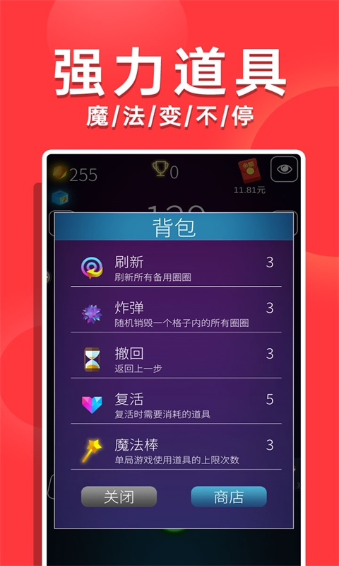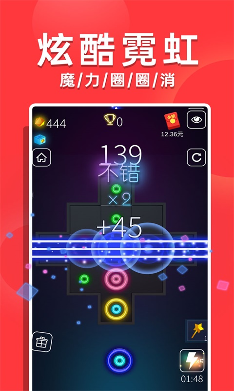 玩法简单易上手,滑动屏幕,随时开玩,放置满屏的魔力圈圈;