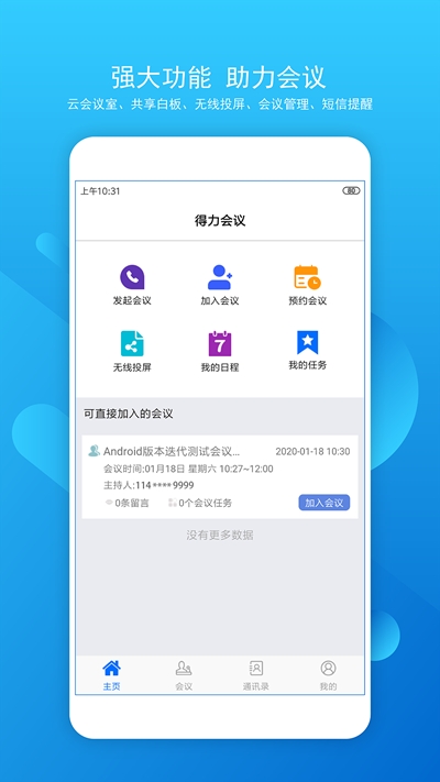 得力云视频会议平台是一款非常优质的云视频直播App,目前为止还有很多公司的员工还在家中进行办公,每天都需要联合各个部门开展视频会议,采用全新的网络信号传输的模式。再软件中是拥有全新的功能,云端的云会议室,让会议能变得更加的轻松流畅,不会影响在家中的办公效率。