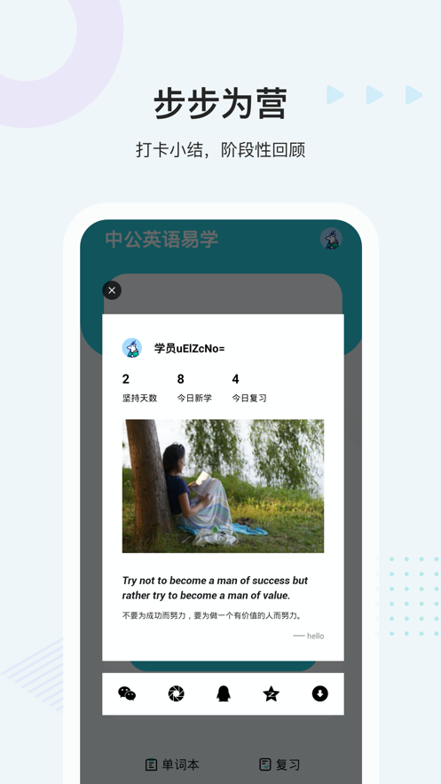 中公英语易学是背单词app。我们精心教研单词内容,打磨核心记词流程,制定个性化单词学习方案,提供强化复习,小结打卡等功能,让英语学习变得轻松。汇集了海量英语单词内容可以了解,可以自由选择教材在线学习,可以随时添加词书内容,随时统计每日学词数据,还可以开启每日提醒学习服务,使用方法简单,轻松提升英语成绩,下载使用吧!
