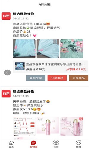 “有票生活”APP天天都能畅快网购,实时更新福利商品,质量完全有保障,并且付款确认还能带来返利佣金。大量商品素材等你收藏保存,让小伙伴们都能分享商品吸引好友购物。配送商品效率更高,希望消费者都能玩转“有票生活”!