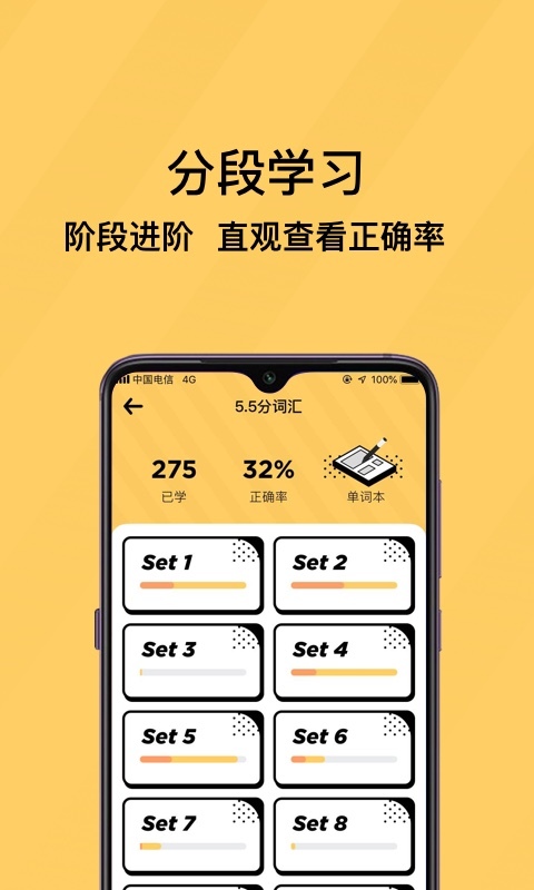 实时查看每个雅思分数段的单词学习进度,每次的单词练习都会生成“练习报告”,记录每一天的进步。
