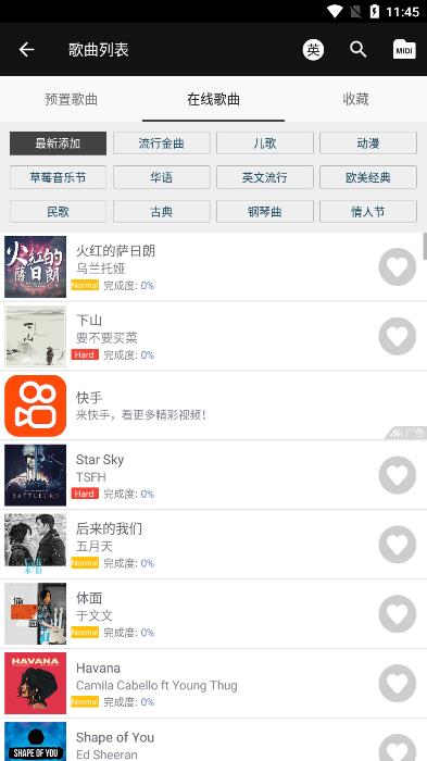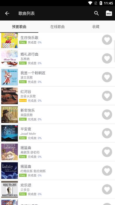 点击学习模式后,会有预置歌曲,在线歌曲,收藏,还可以在线搜曲,点击想学习的钢琴曲
