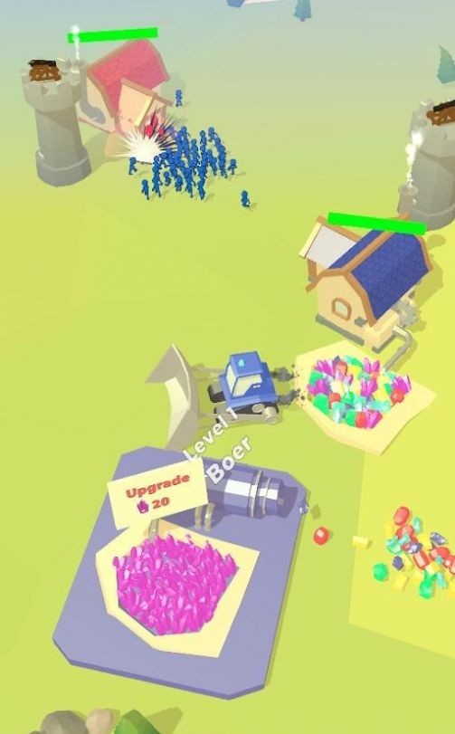 开局可以控制推土机采集从矿场生产出来的宝石,运到兵营,生产小兵;