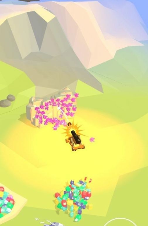 将推土机开到大炮旁边,切换到大炮视角,通过滑动右下角的瞄准系统进行瞄准,然后点击“炸弹”开炮射击,炸碎矿石进行收集,运回矿厂进行加工。