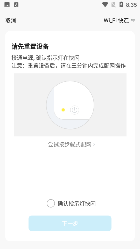1.“Wi-Fi快连”模式:首先,确保设备断电超过10秒钟以后,再给设备通电,接着长按设备上的重置按钮5秒钟左右,直到设备的指示灯开始快速闪烁,设备进入“Wi-Fi快连”模式,您可以按照App上所提示的“Wi-Fi快连”的配网模式对设备进行配网。