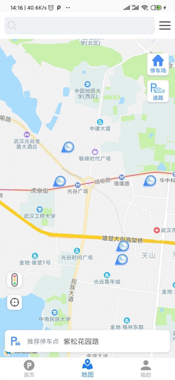 点开app后,手机界面上显示出武汉市800多个停车场,