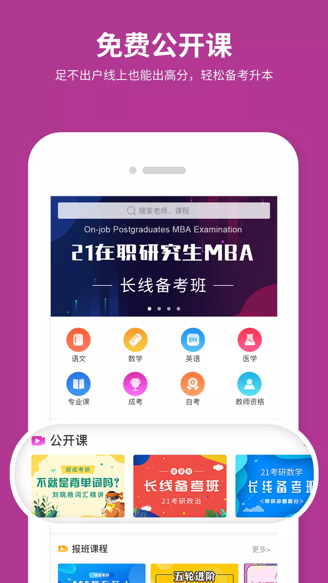 点播课程:支持数学、英语、管理联考、政治、专业课、在职研、题库、公开课等八种课程的服务;