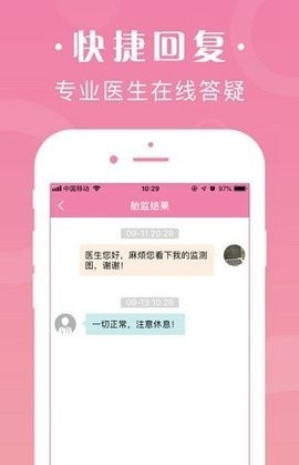 4.帮助孕妇实时监控胎心数据,并向诊断医生发送,也可查看医生对胎心数据的回复。