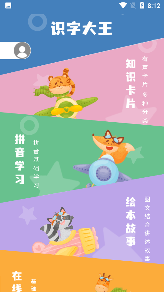 识字大王app中提供有声卡片进行识字,拼音的基础学习、图文结合的绘本故事,基础简单的生字学习以及必读经典故事,卡片精美可爱,能够吸引孩子的注意,有声阅读标注,引导孩子们跟着一起朗读,让小朋友们爱上学习。宝宝看图识字,词汇量丰富,体积小,使用简单,占用内存低,安装后无需任何下载就能使用。数十万家长当前的选择,给宝贝的成长礼物。