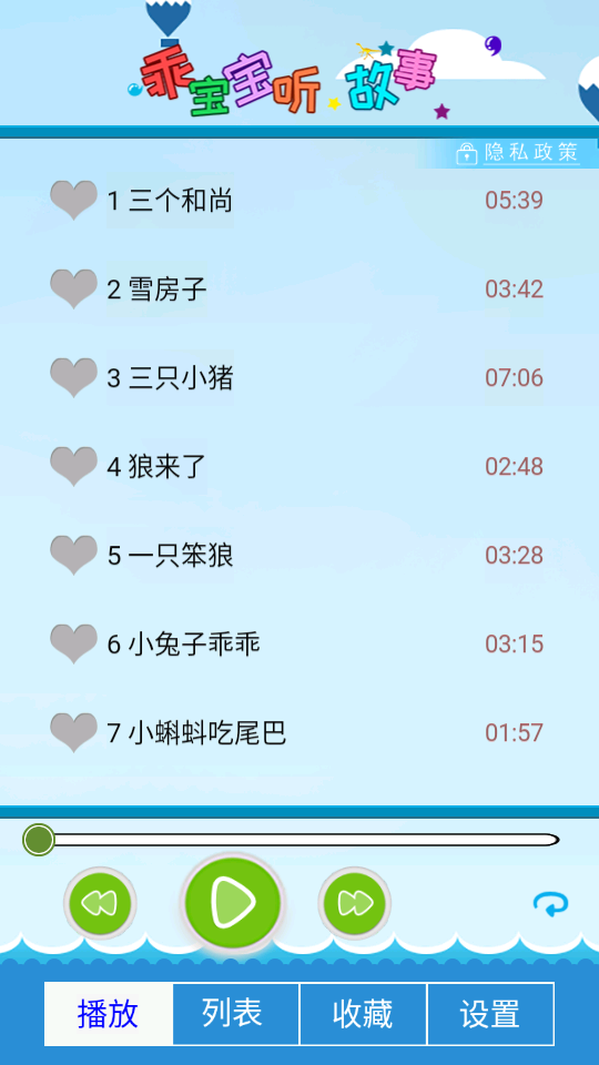 乖宝宝听故事,让宝宝更聪明,让妈妈更省心。包含儿歌、儿童睡前故事、儿童歌曲大全、童话连载系列故事胎教音乐,寓言故事,民间故事,唐诗,成语故事,三十六计,课文朗读,中国历史故事,,历史名人故事等。 宝宝故事精心挑选和制作出许多经典动听的故事,保持更新,让你不再为讲故事而烦恼。