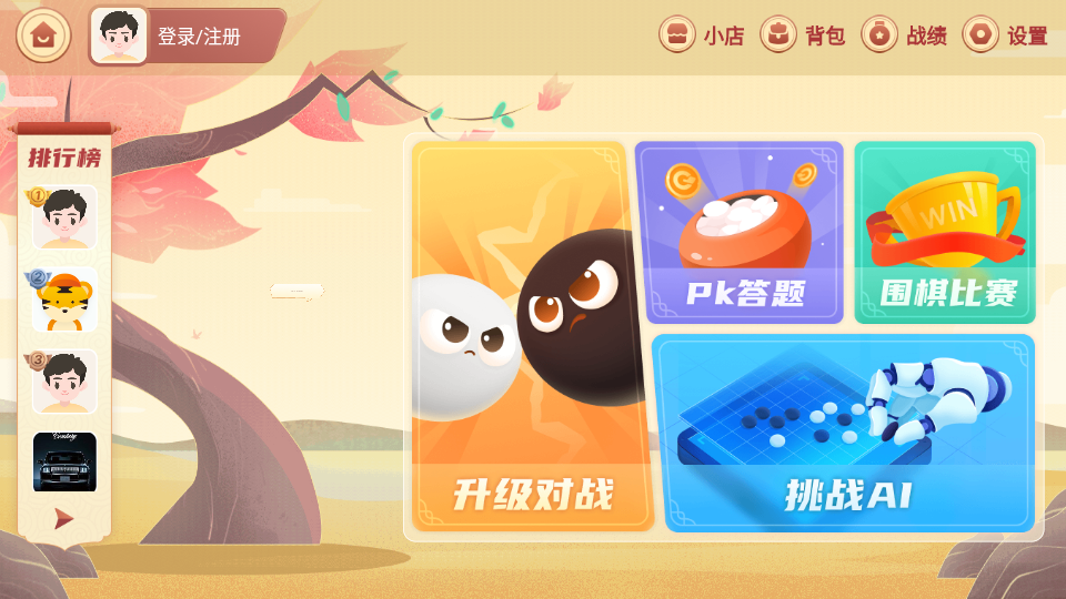 挑战AI:挑战不同水平的AI,打败AI,闯关成功,可获得金币奖励和神秘礼品
