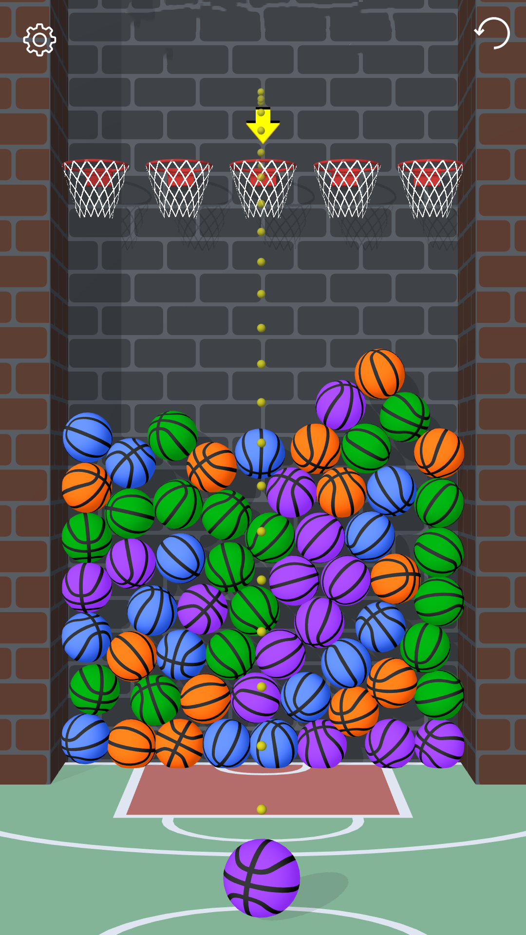 投篮消消乐是一款玩法非常新颖的消除游戏,在你的屏幕前会出现很多篮筐,篮筐的下方是非常空旷的,你可以通过辅助线来进行投篮,颜色不同的篮球需要分开投掷,但是他们掉落下来的时候会弹来弹去,地上会显得杂乱无章,你需要将相同颜色的球碰撞在一起,这样就能将他们消除,在规定时间内达到目标分数,就算闯关成功。