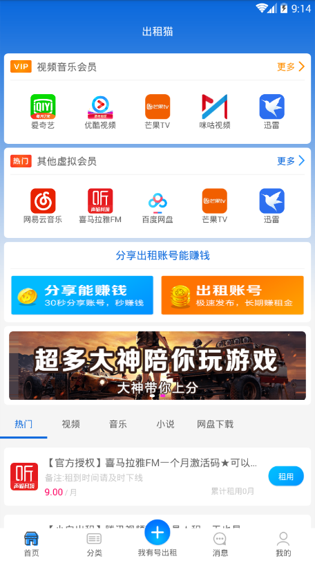 出租猫app是一款安全可靠的账号出租平台,这里不止提供了游戏账号的出租,还提供了视频会员账号、小说会员账号、网盘账号等交易,只要是有价值的账号都可以在这里得到利用,让你花少量的钱使用到更高级别的账号!