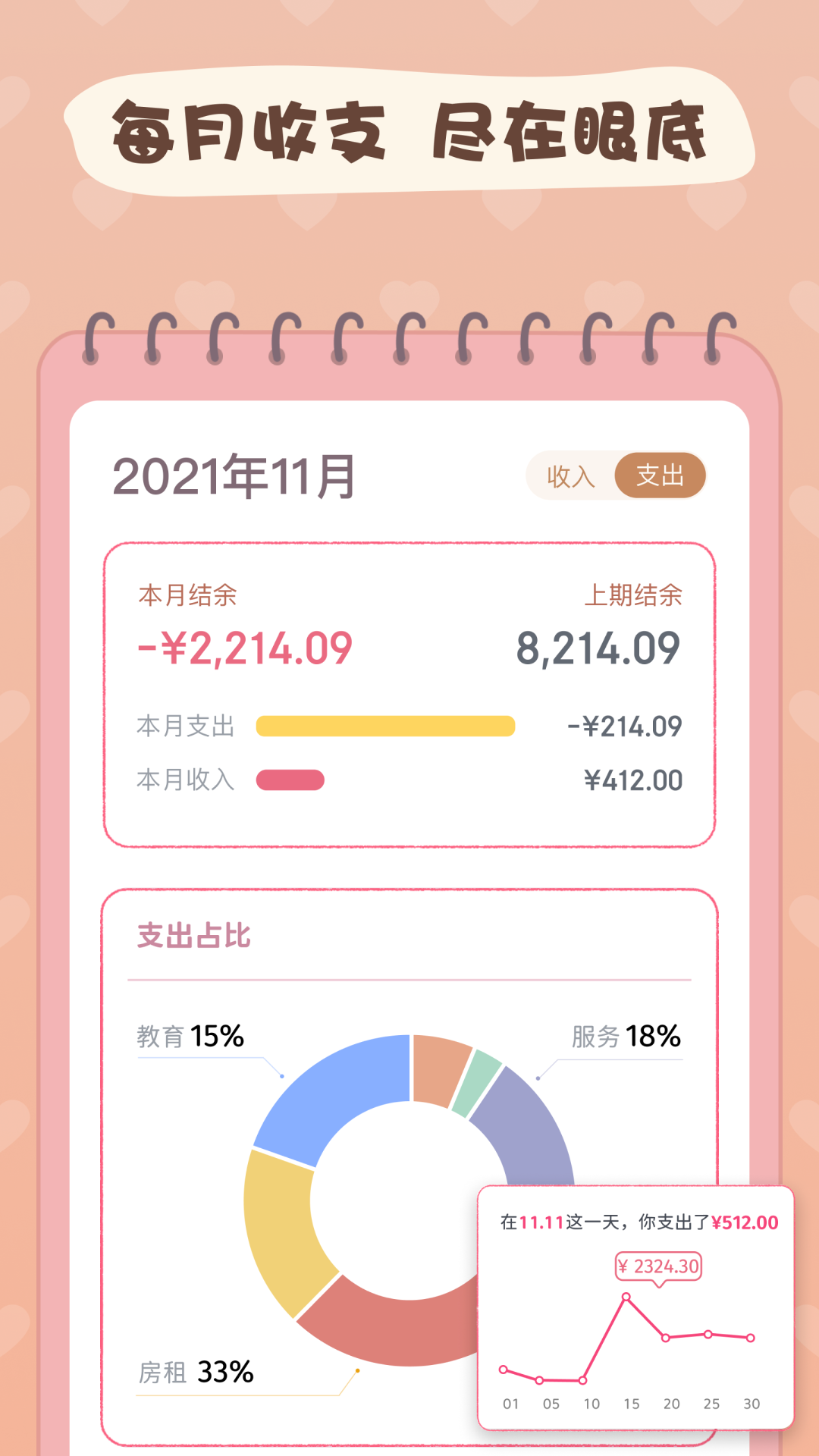 收支趋势图,饼图等统计图表,帮你快速分析消费情况;