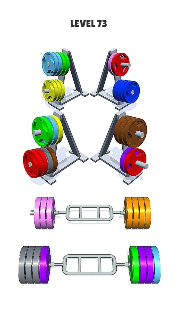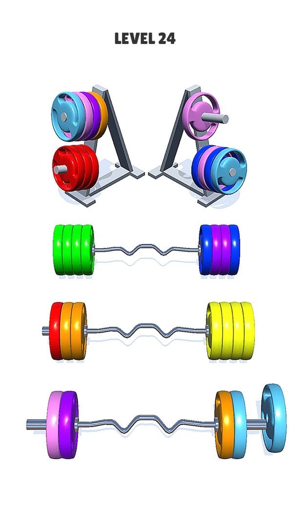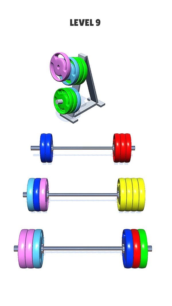 杠铃排序难题作为一个超级受喜爱休闲十足的分类排序游戏,丰富的关卡可以供玩家们挑战,随着你的闯关杠铃的数量也会增加,玩家需要将不同颜色的杠铃按照颜色来正确排序堆放,超级考验玩家逻辑能力,将它们排序成功!