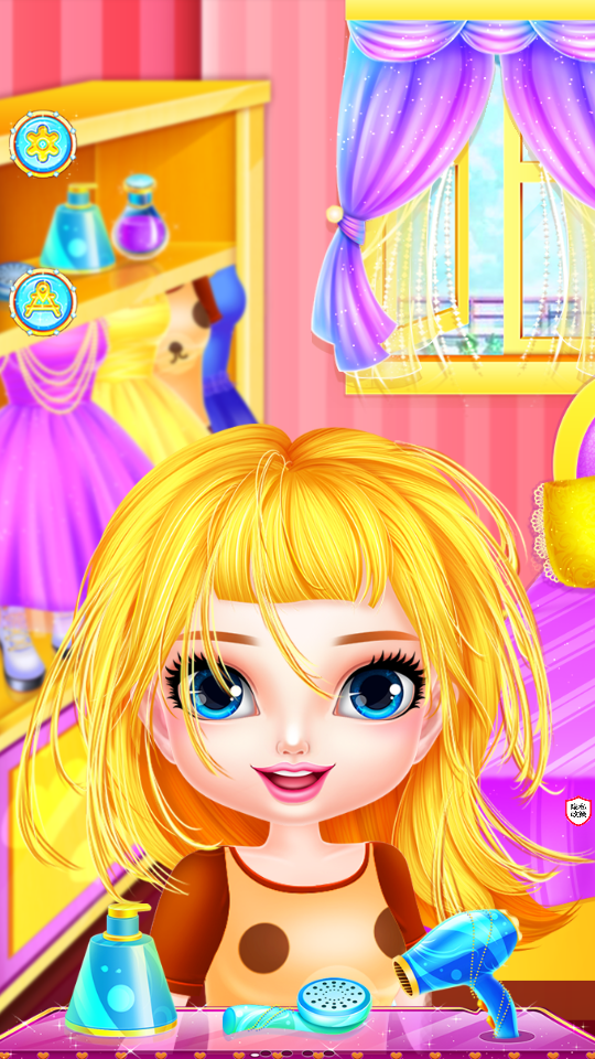 洗头,给公主及时进行洗头操作,洗完后为其吹干。